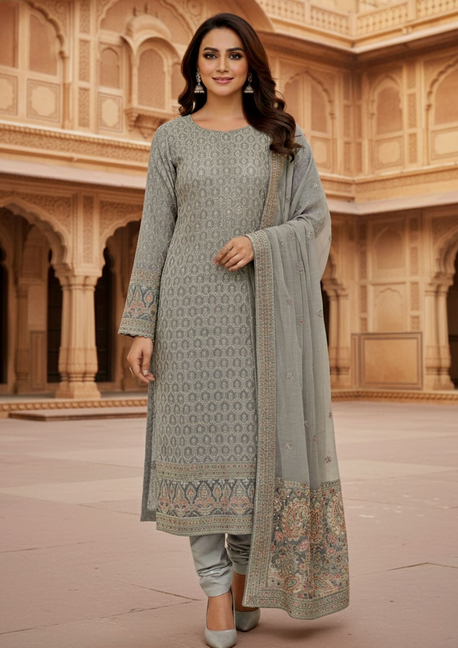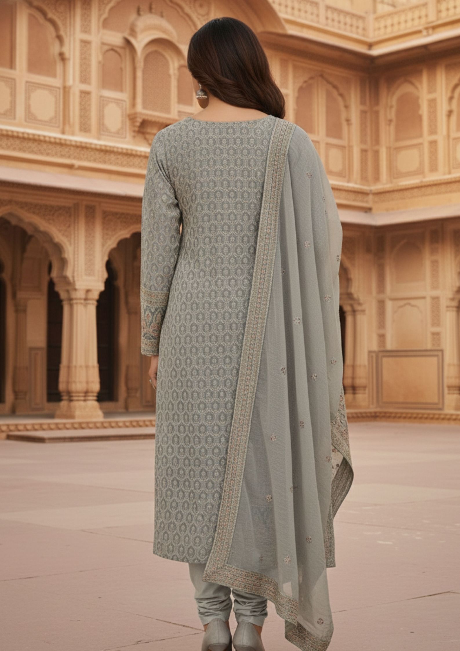 Unstitched Soft dove-grey georgette suit with ivory thread embroidery and subtle sequin highlights