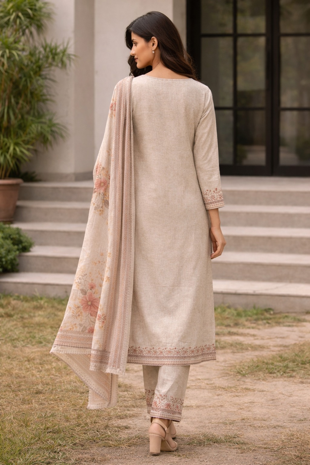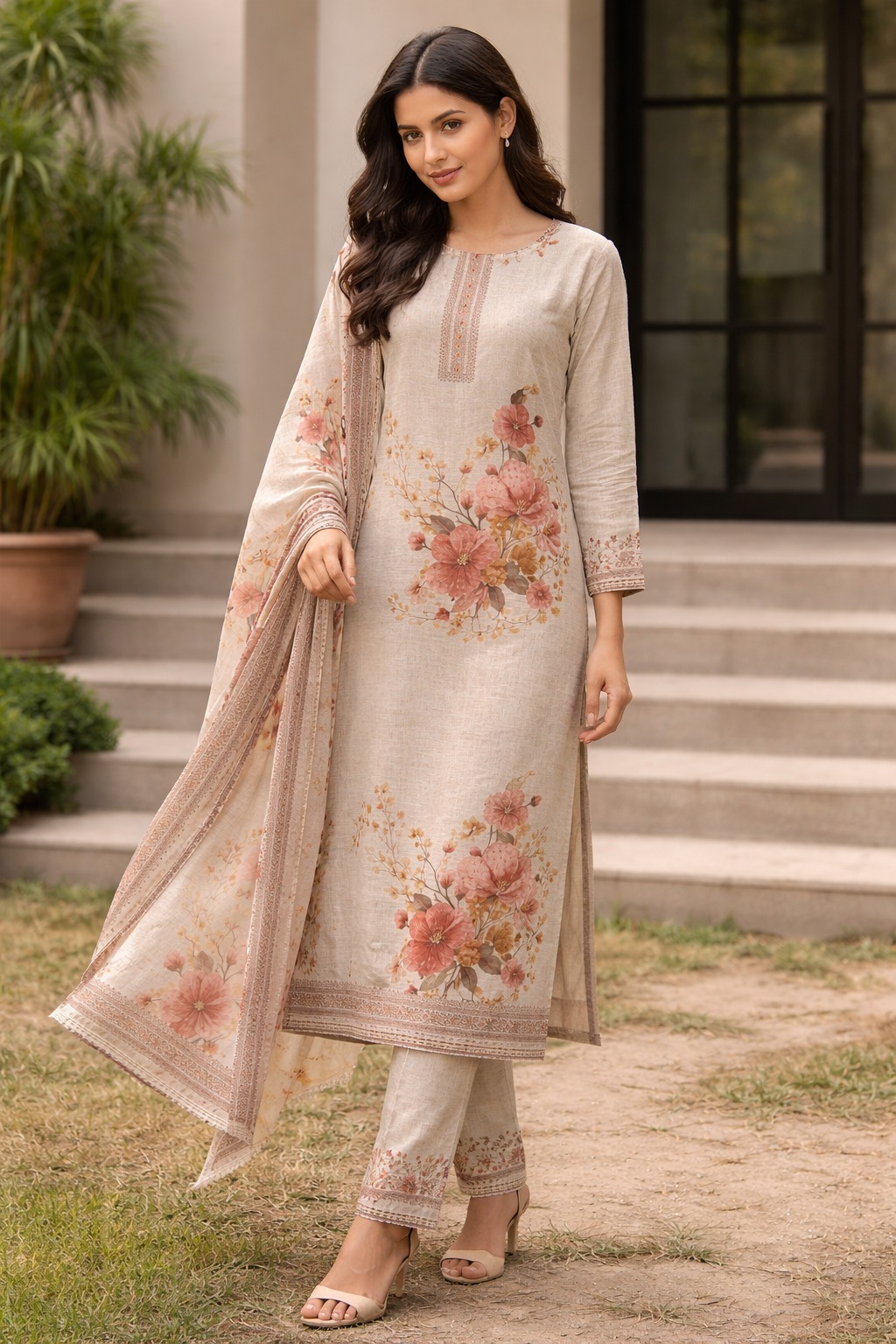 Unstitched beige with floral printed cotton suit set with dupatta