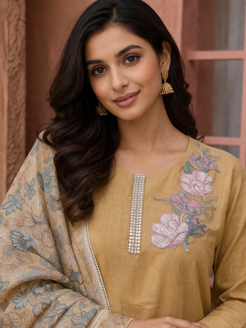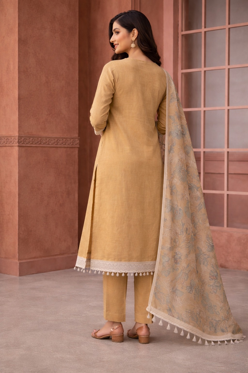 Unstitched yellow embroidered cotton slub suit set with dupatta
