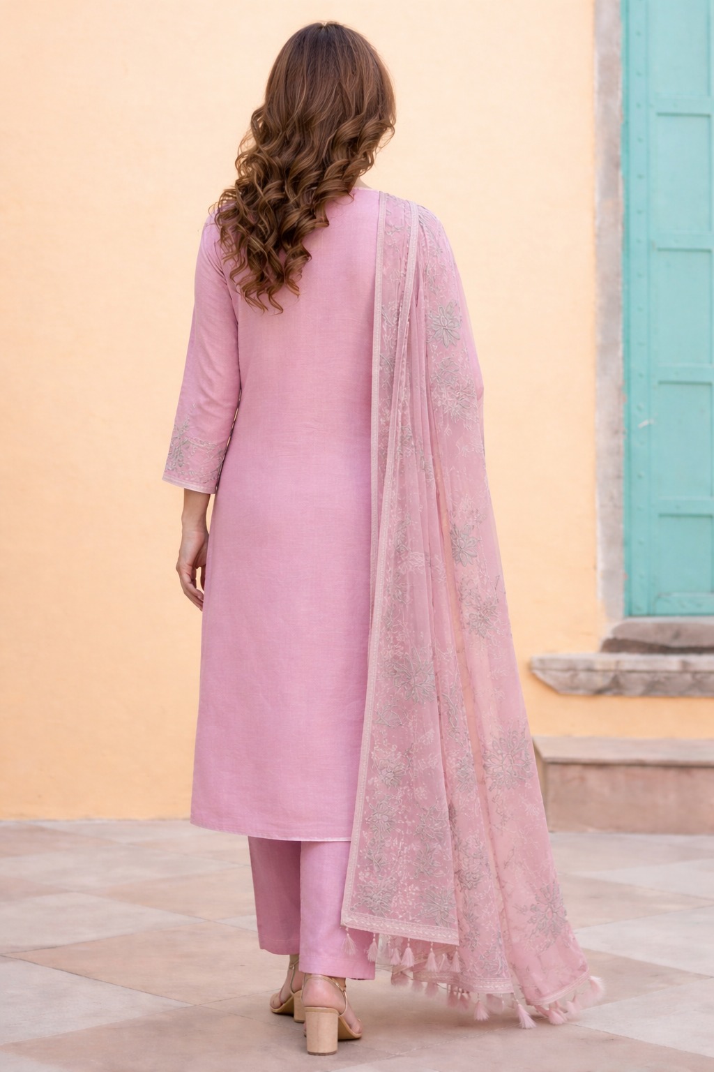 Unstitched pink embroidered cotton slub suit set with dupatta